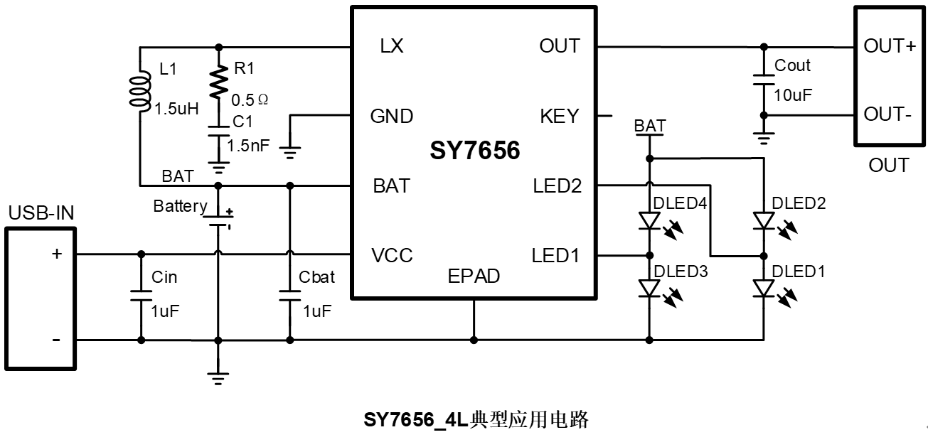 KEY键及LED指示,可订制版本及功能——SY7656_2L:无需接KEY键,升压常输出,轻载自动关闭LED显示;2颗LED充/放电状态指示; SY7656_KEY2L:单击KEY键显示电量并启动/关闭升压,自动关机功能(VOUT掉到0V);2颗LED充/放电状态指示; SY7656_4L: 无需接KEY键,升压常输出,轻载自动关闭LED显示;4颗LED充/放电状态指示; SY7656_KEY4L:单击KEY键显示电量并启动/关闭升压,自动关机功能(VOUT掉到0V);4颗LED充/放电状态指示。